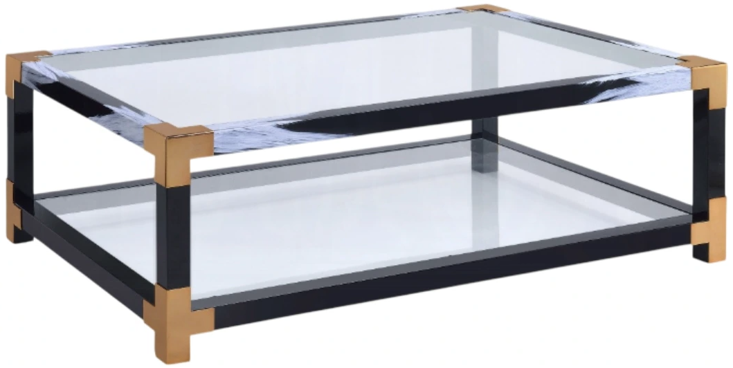 The Lafty Coffee Table blends elegance with practicality. Featuring a clear tempered glass top and bottom shelf, this rectangular table offers an open compartment for storage. Its hand-brushed white and copper metal square legs, top trim, and crossbar support frame add a touch of sophistication.Read More