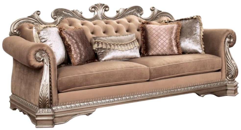 The ACME Furniture Northville Sofa in antique champagne and brown features a tufted back, elegant wood accents, and plush upholstery. Its detailed carvings and refined silhouette add timeless charm, making it a perfect centerpiece for traditional or classically inspired living spaces. A stylish blend of comfort and sophistication.Read More