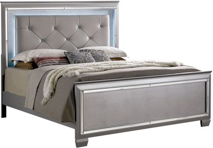 Specifically designed to accentuate a glamorous feel, this bedroom collection brings a combination of class and contemporary style to your bedroom. Crocodile embossed veneer and silver lining panels stand out throughout every piece while the button tufted headboard adds a charming effect. The headboard has built-in LED lights to illuminate the mood.