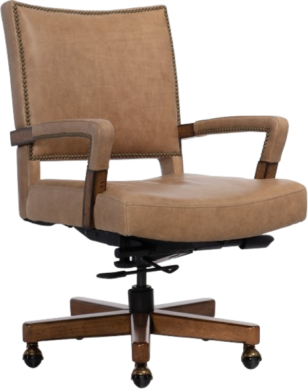 Get studious with the stylish Chace executive swivel tilt chair featuring a tight seat and back and flared wood arms with leather covering accented by brass nailheads. Upholstered in the Vernerando Latte aniline top grain leather, the modern chair is height-adjustable, on casters and has a wood-capped base.Read More