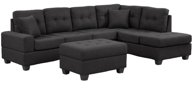 The 3-piece black sectional with ottoman provides ample seating and comfort for your living space. Featuring a sleek design and cushions, this sectional offers versatility and style, making it a perfect addition to any modern home.Read More